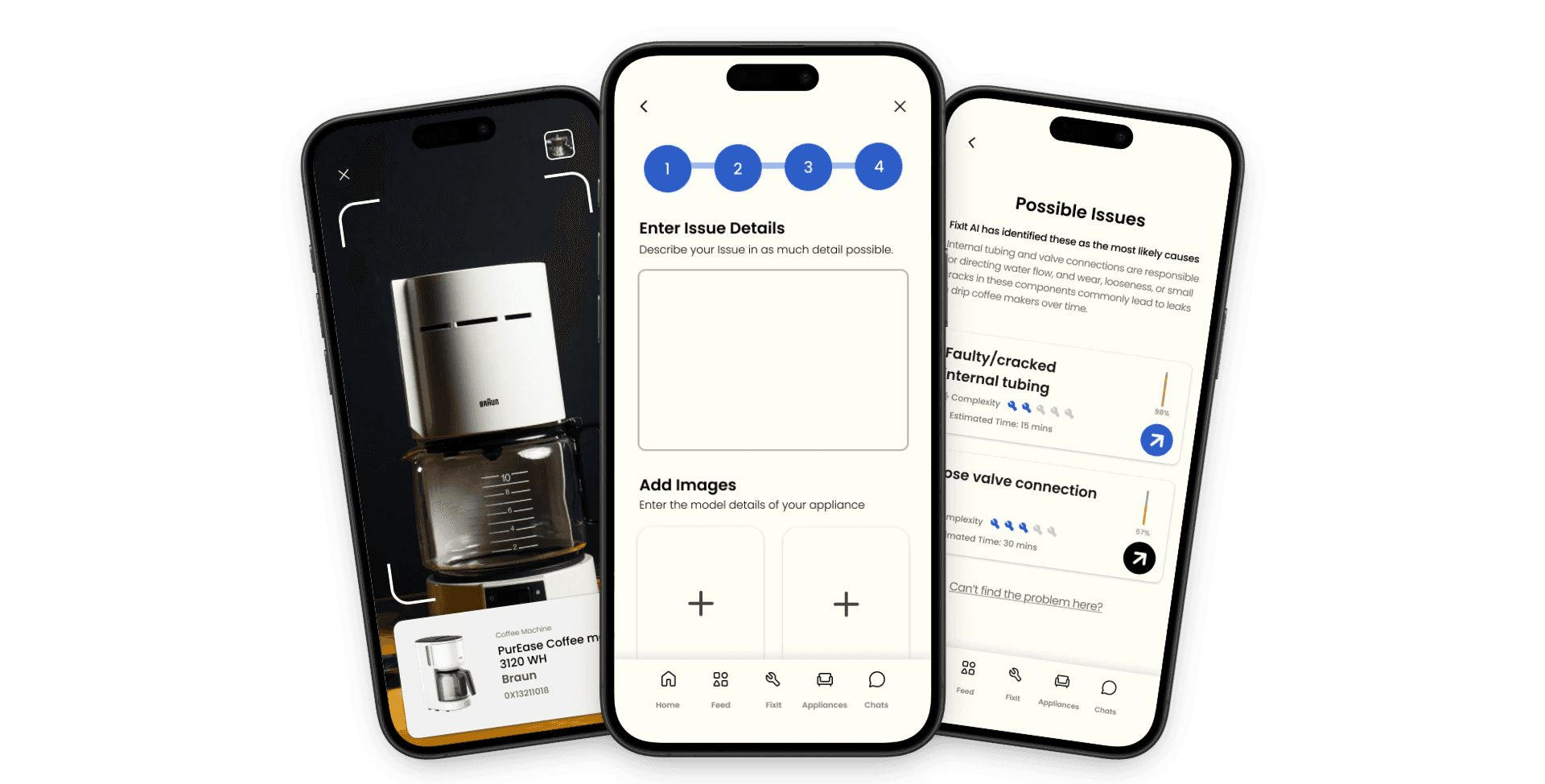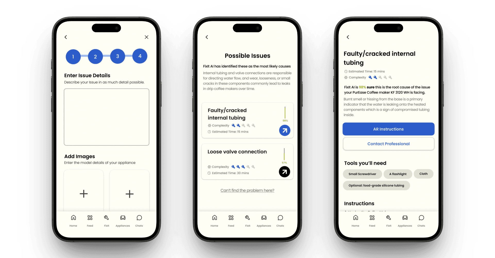 Users can input their appliance issue, receive an AI generated diagnosis and cost estimate, and instantly book a verified technician.