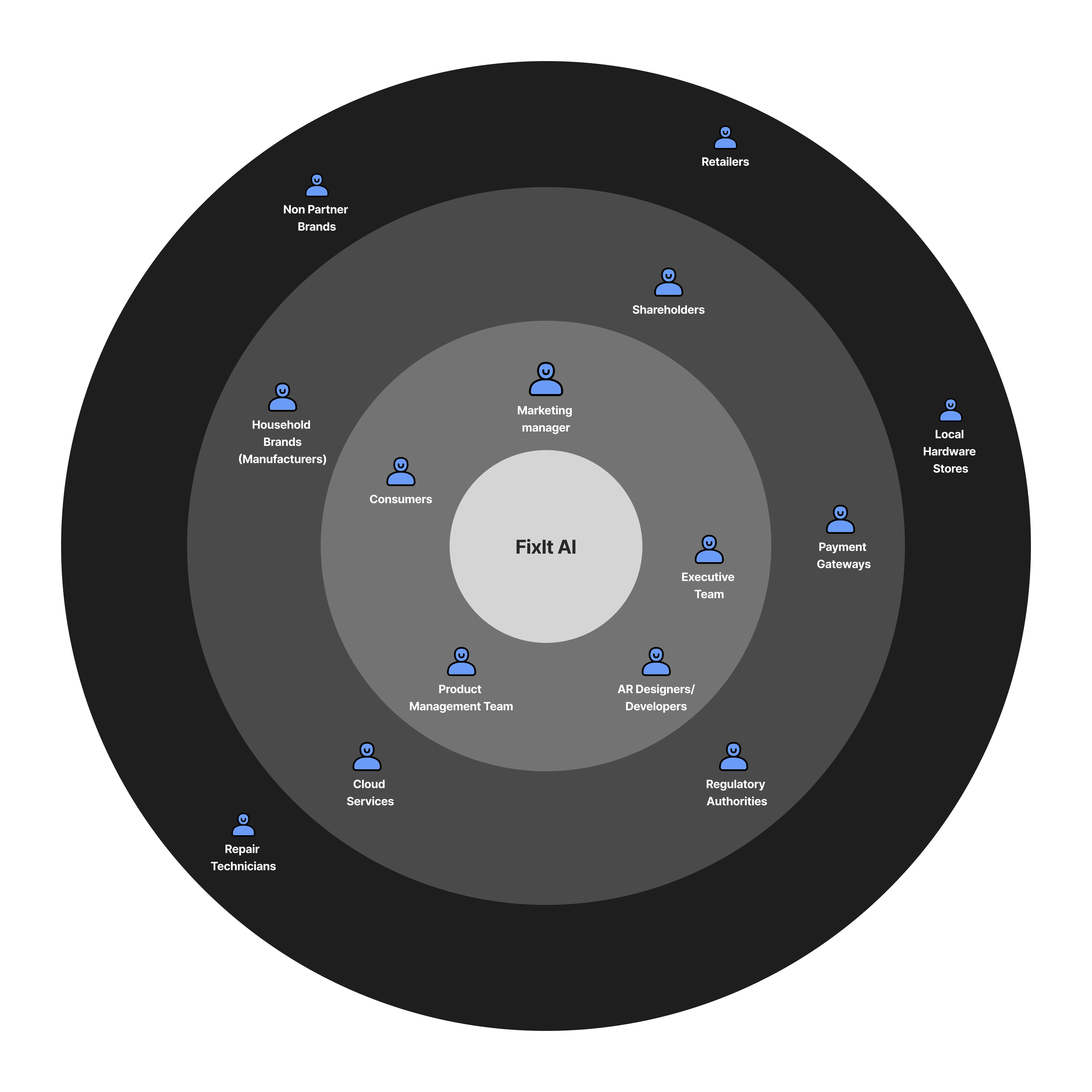 I mapped out key individuals and groups like the front end users, internal teams (AR developers, marketing), and external ones (retailers, payment gateways, regulators) based on their proximity and influence on the app.