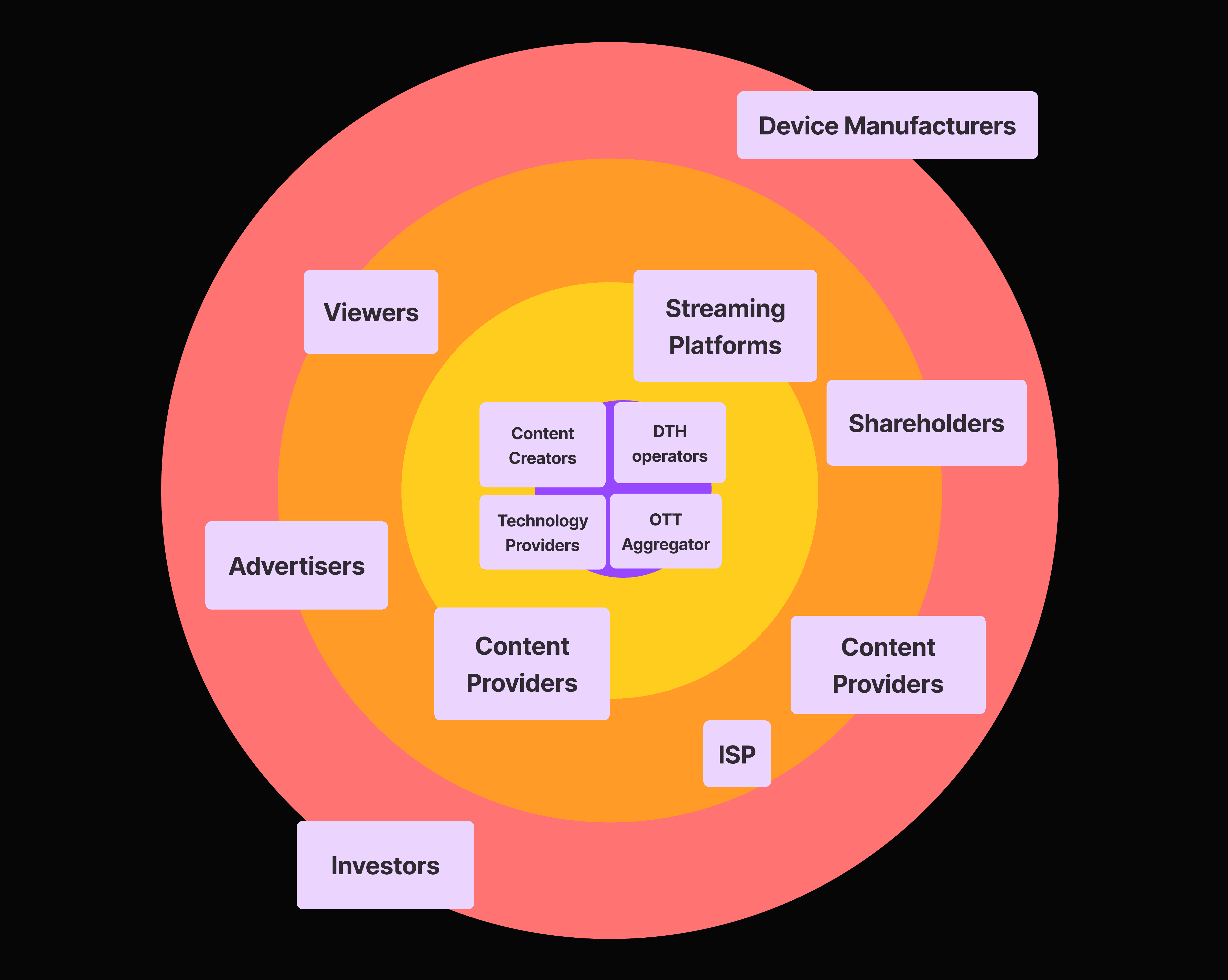 The stakeholder map helped visualize the complex network of dependencies between users, OTT platforms, content providers, and advertisers, and their influence on the aggregator’s ecosystem.